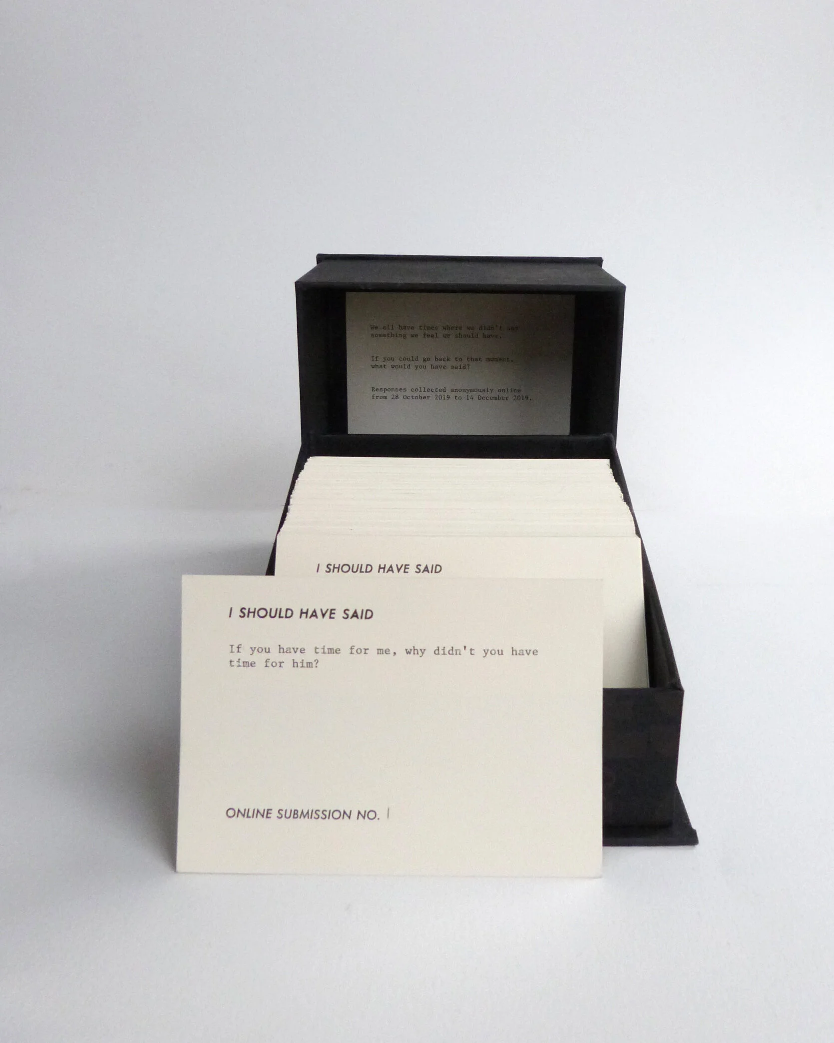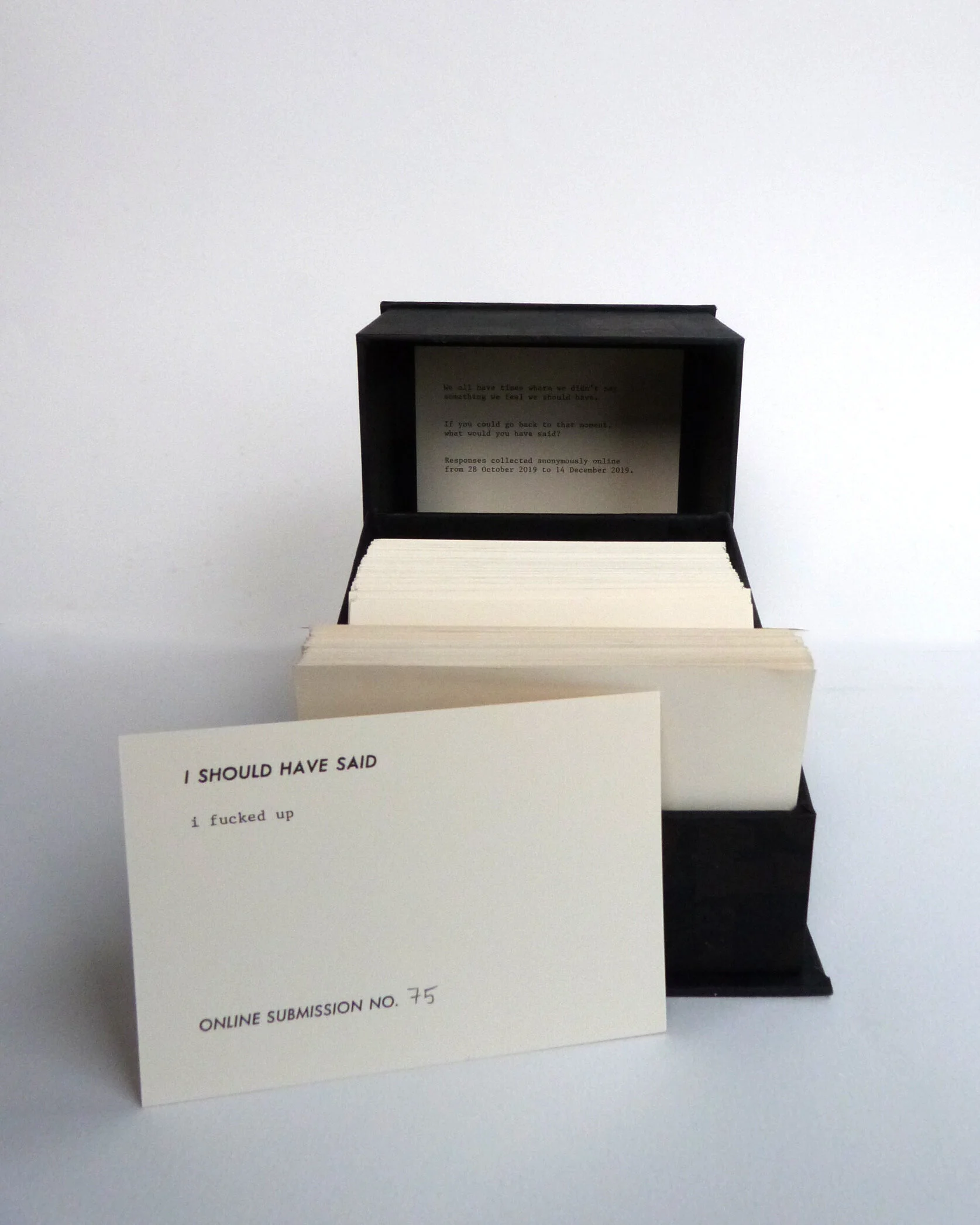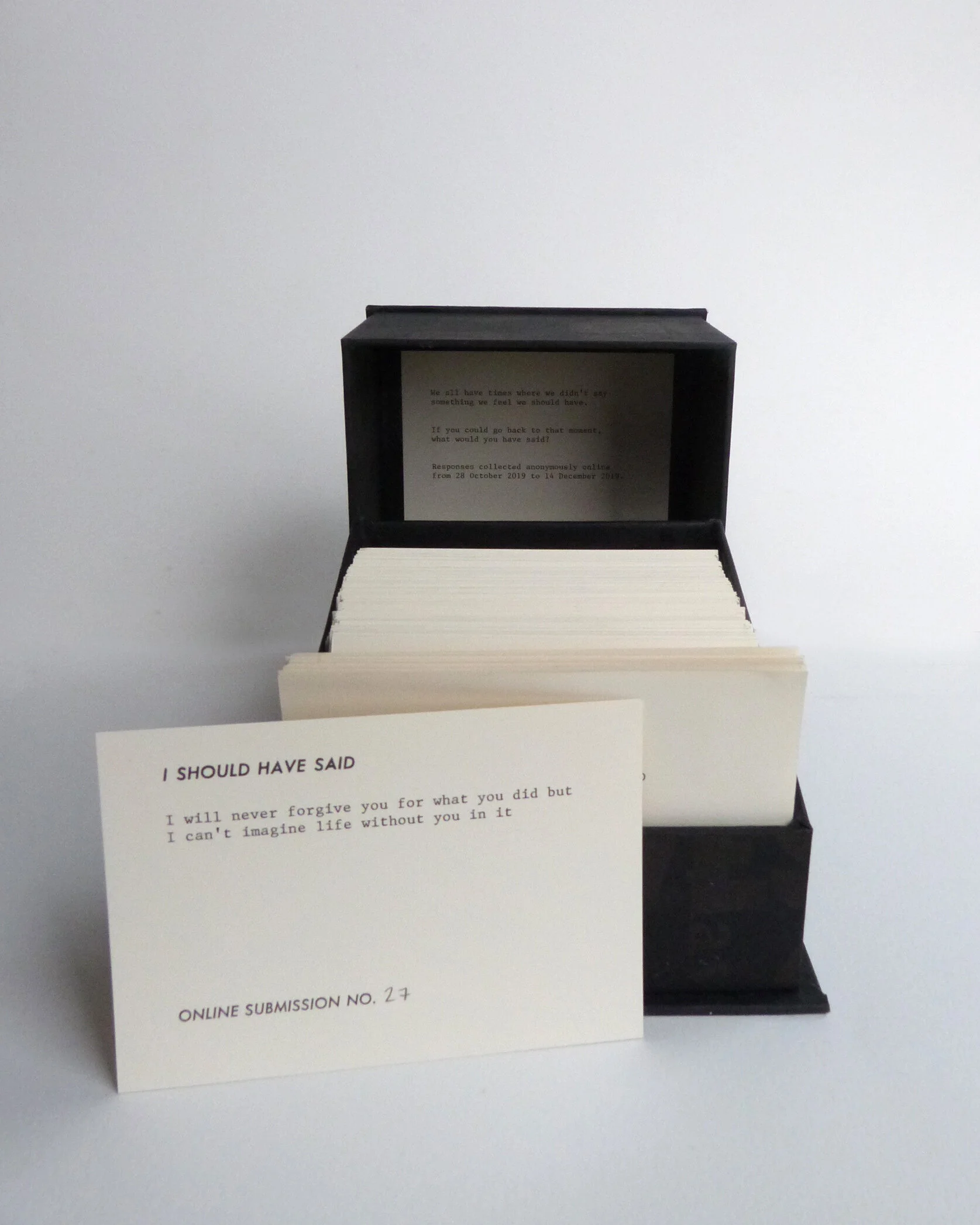 THINGS I SHOULD HAVE SAID is a filing box of cards, holding anonymous admissions of things someone did not say that they feel they should have. In contributing to this project, these regrets are finally aired and cherished both by the artist in the process of creating the cards, and by the viewer as they thumb through the 100+ responses in the box. This project is still accepting submissions at tinyurl.com/shouldhavesaid.