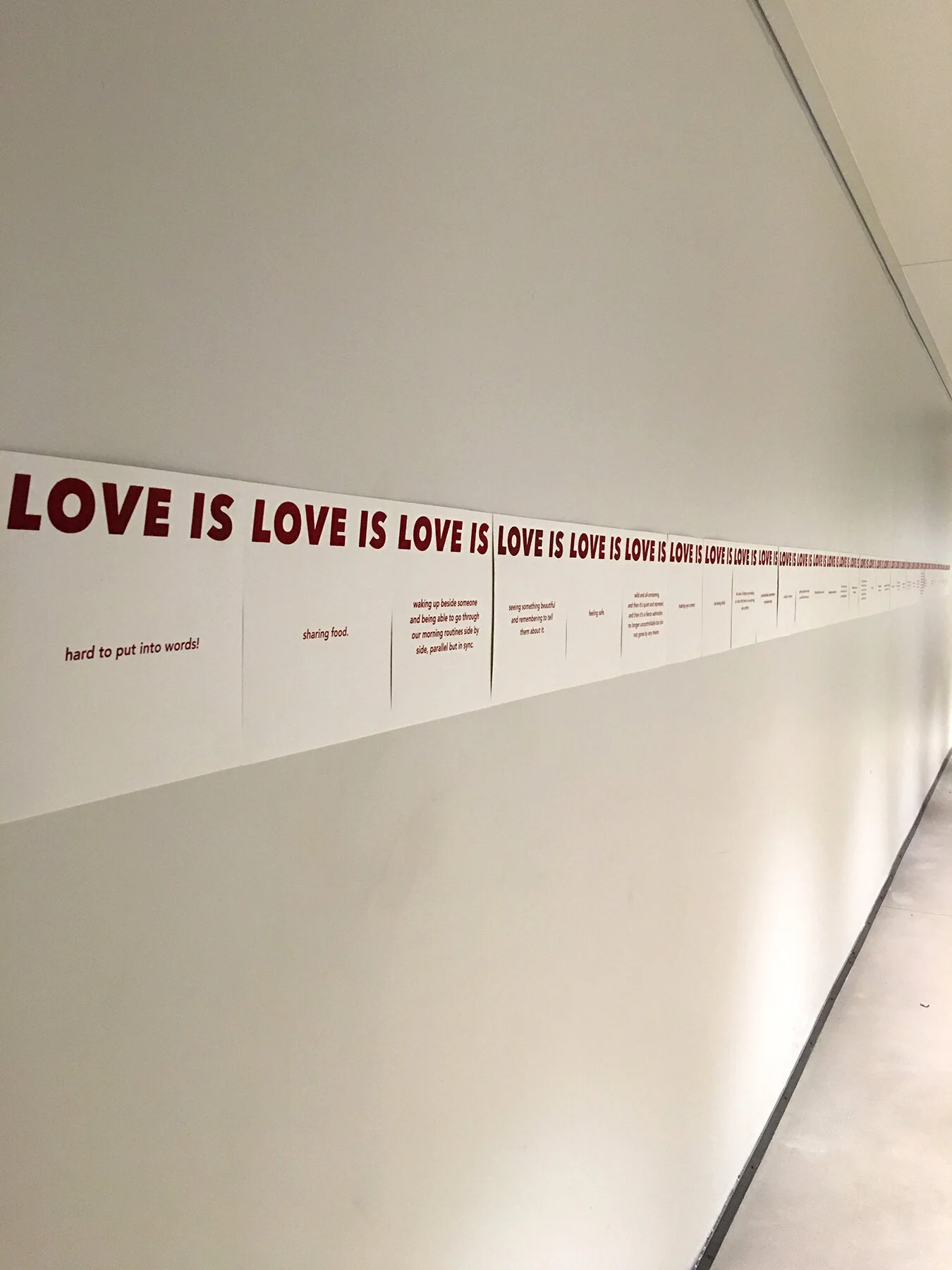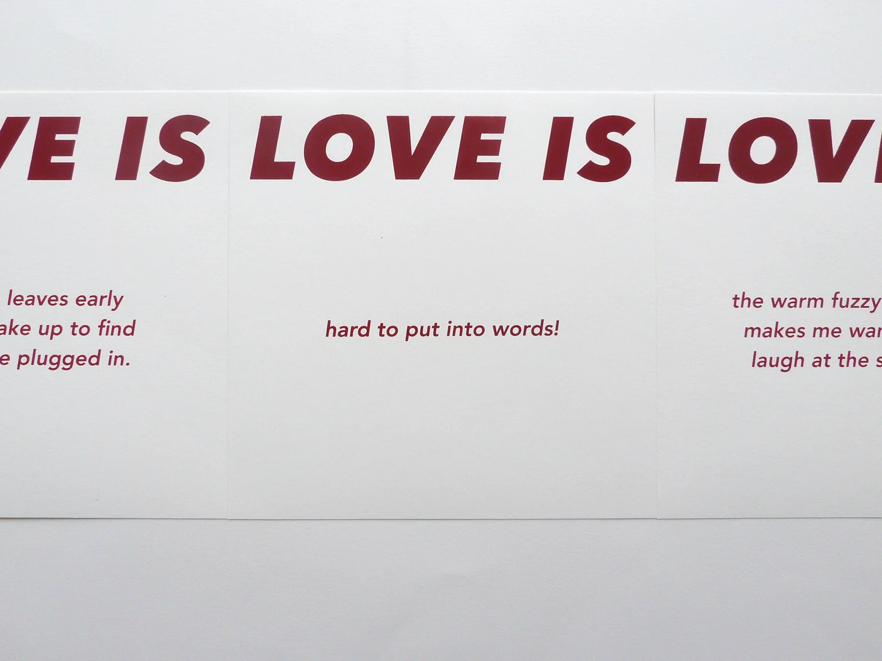 LOVE IS, a series of 36 screenprints, displays anonymous descriptions of how someone defines or feels love. In its installation, the viewer may walk along this row, pausing to read intimate conceptions of love and care.